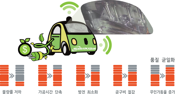 인공지능 자율 주행 컨셉의 NCBrain AICAM은 모델링만으로 안전하고 빠르게 무인 자동화 가공을 진행 합니다. 아이콘 5회 클릭 만으로 무인 운전은 물론