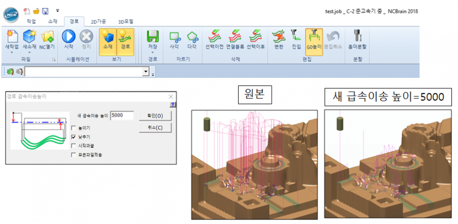 경로-> G0높이: 원본 G0의 높이를 소재의 상대 값으로 적용하여 G0높이를 높이거나 낮추는기능