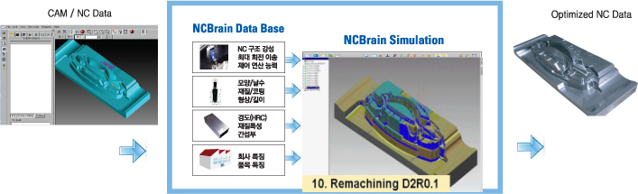 into optimized NC data by simulation of NC Data. The optimized NC Data make the safest and the fastest machining at all times without any accident